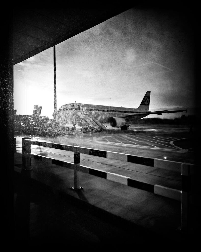 black and white image of portable airline stairs taken at the Dublin Airport.